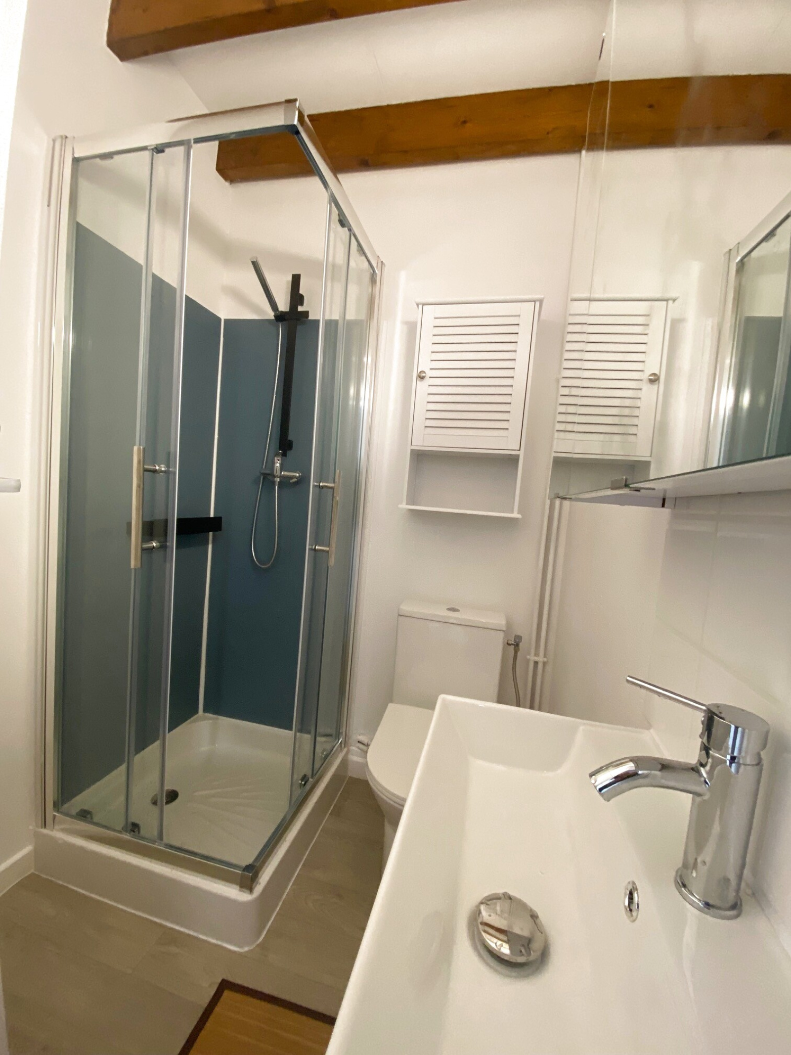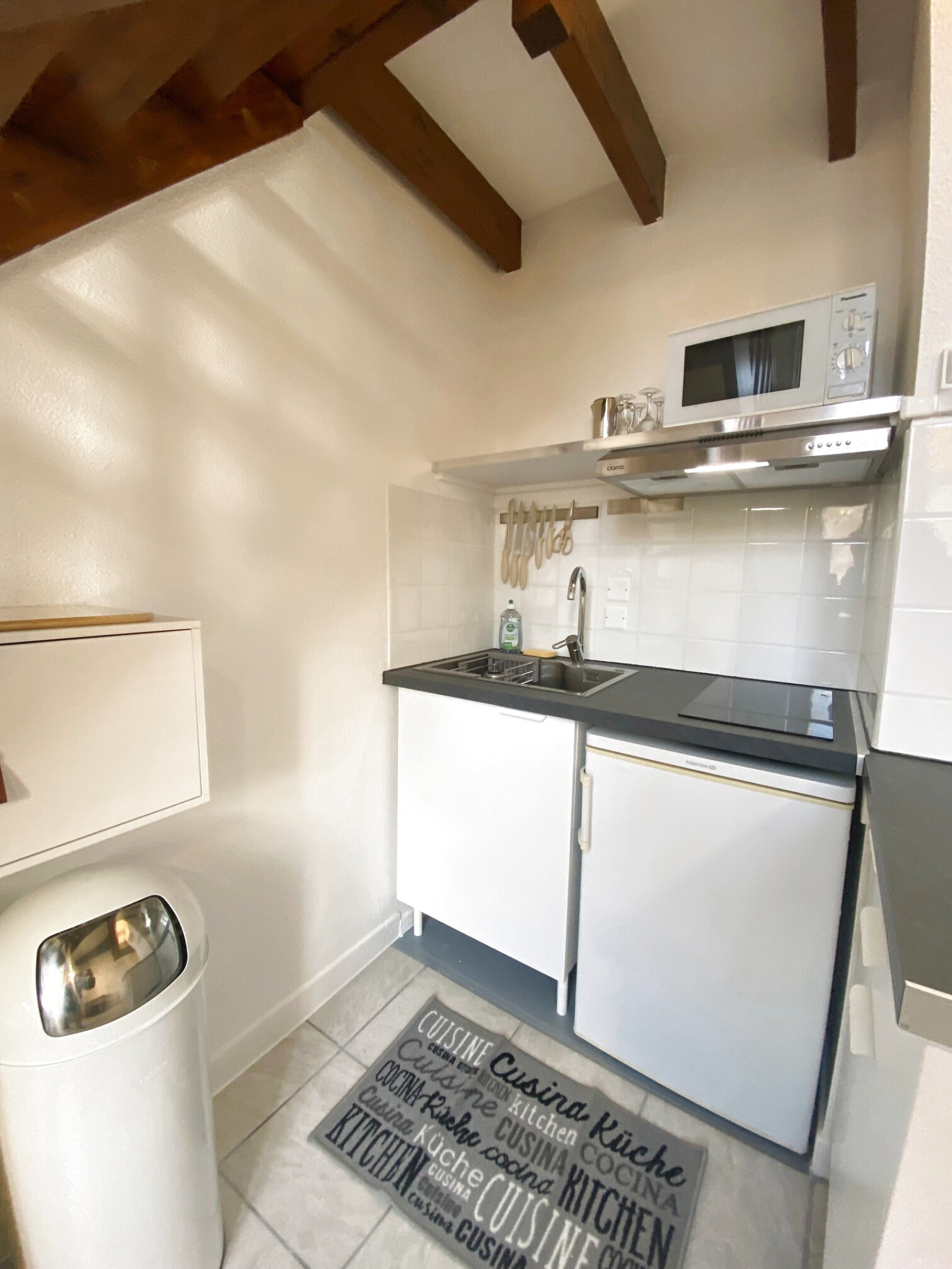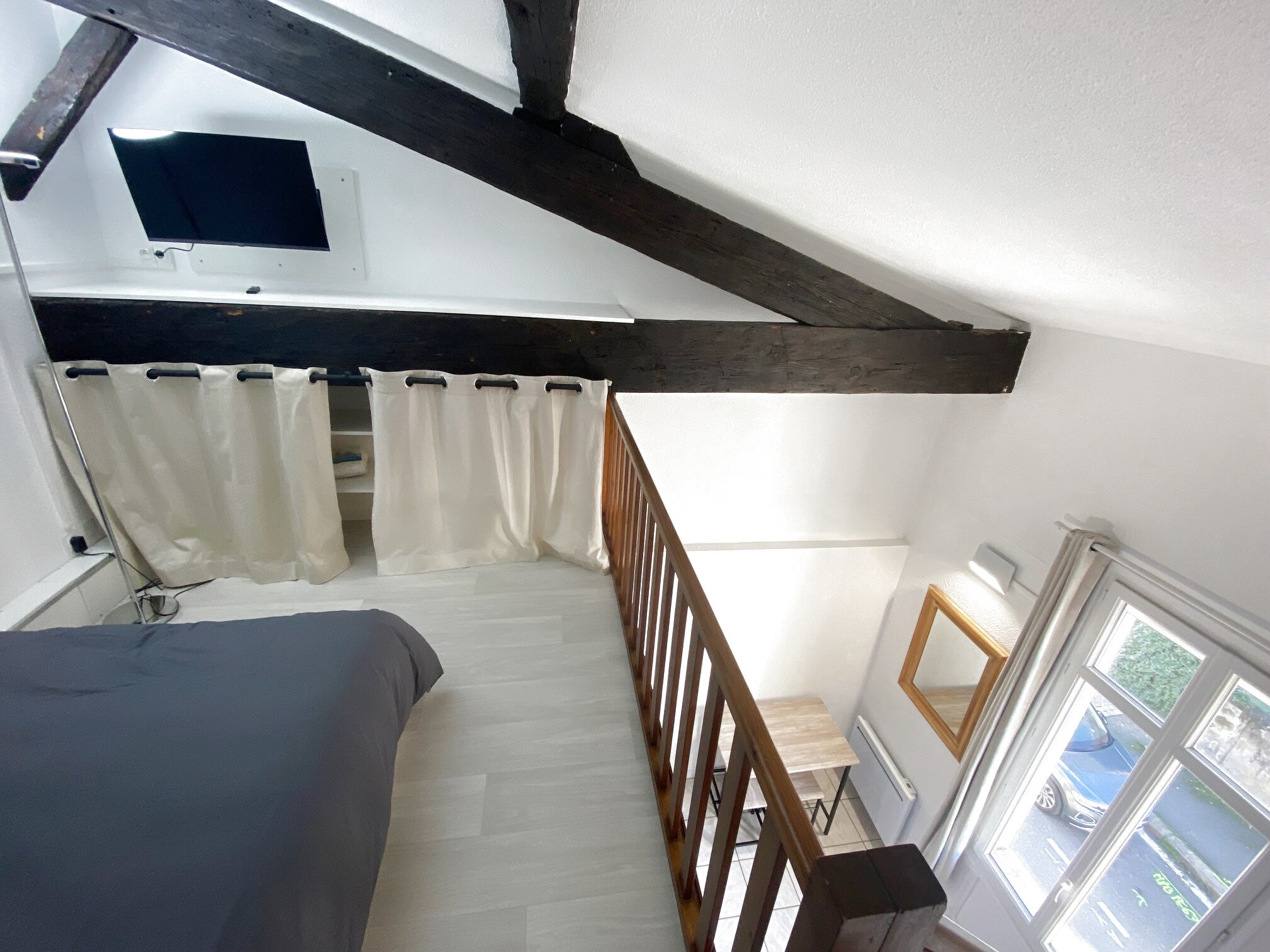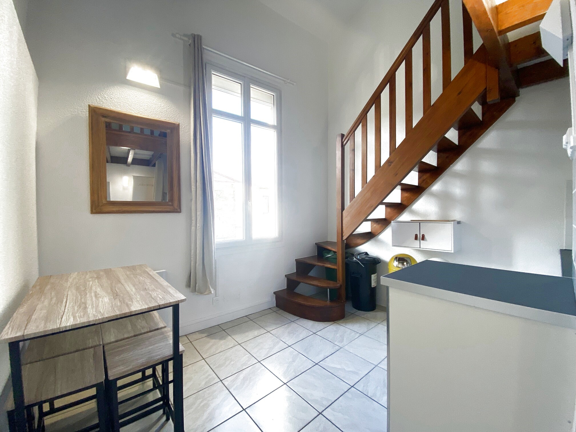 L’appartement se compose d’un coin cuisine aménagé et équipé, ouvert sur un séjour lumineux, d’un espace nuit en mezzanine, ainsi que d’une salle d’eau avec W.C.